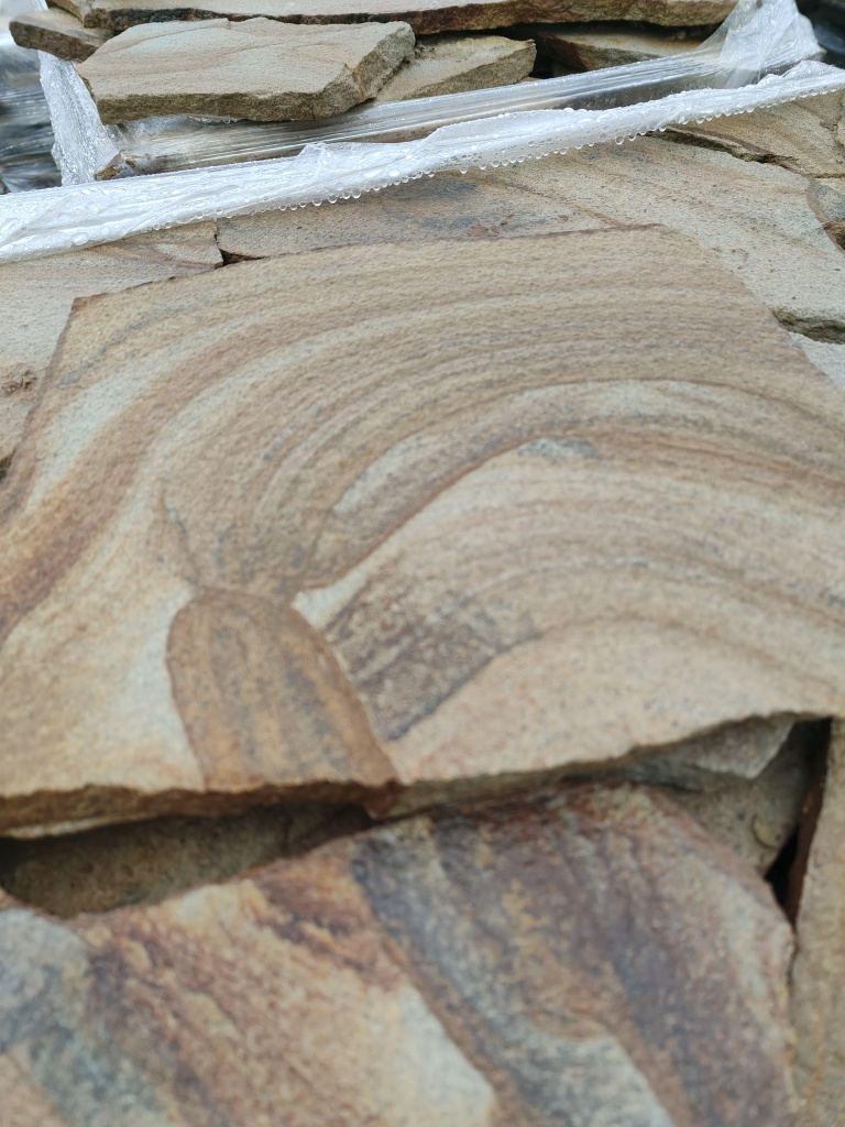 Песчаник жёлтый с разводами - для работ по облицовке цоколя, отмостки, стен, фундаментов, заборов.